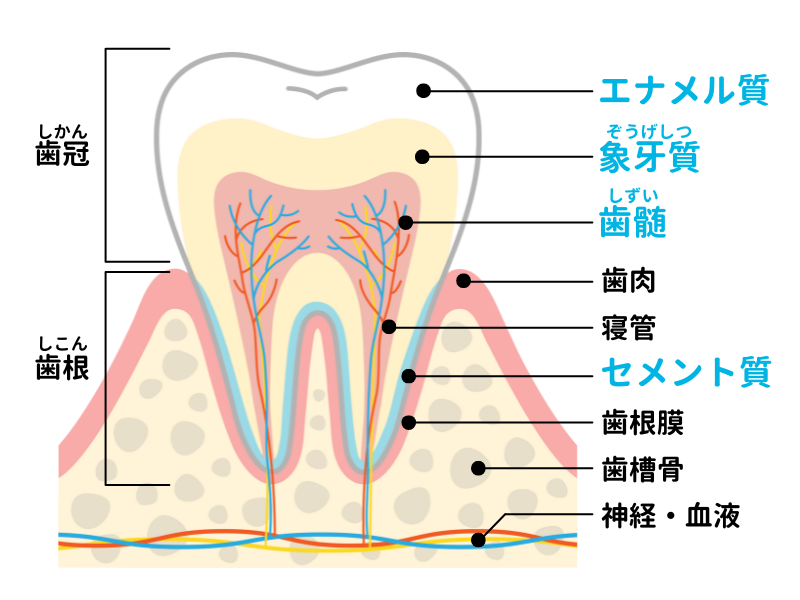 歯は「エナメル質・象牙質・歯髄・セメント質」という4つの組織が力を合わせて働いています。
