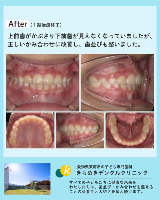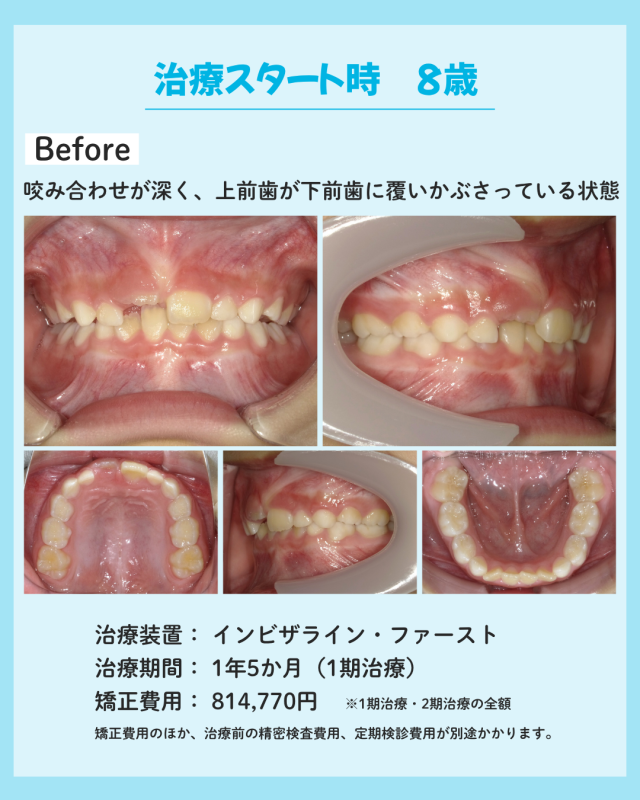 インビザライン・ファーストによるマウスピース矯正を用いて過蓋咬合の症状へのアプローチをおこないつつ歯列を広げながら歯並びを整える治療を行うと同時に、生活習慣・食事の仕方・姿勢の指導なども合わせて実施しました。