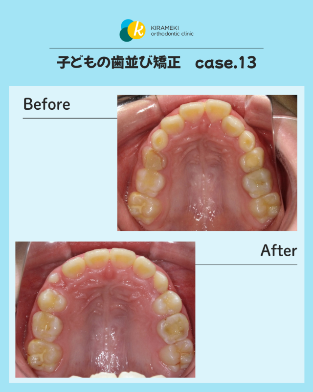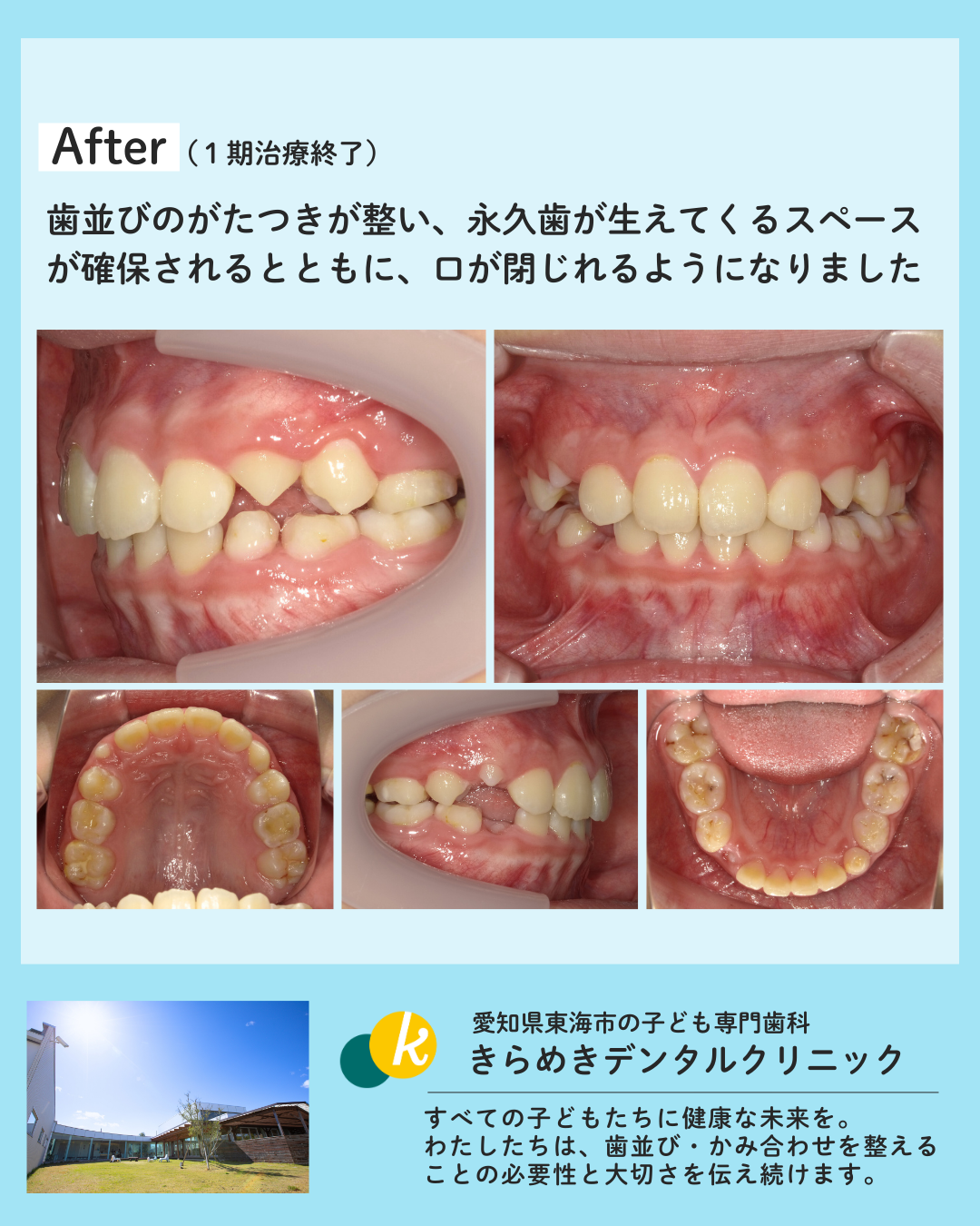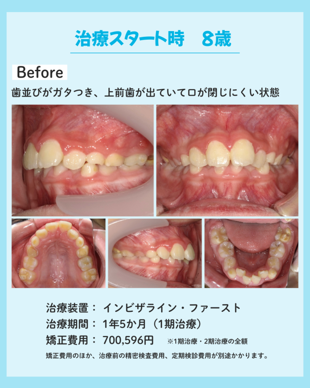 インビザライン・ファーストによるマウスピース矯正で、歯列の拡大を行い、永久歯が生えてくるスペースを確保するとともに、歯並びを整えつつ、まずはお口を閉じれることを目指しました。