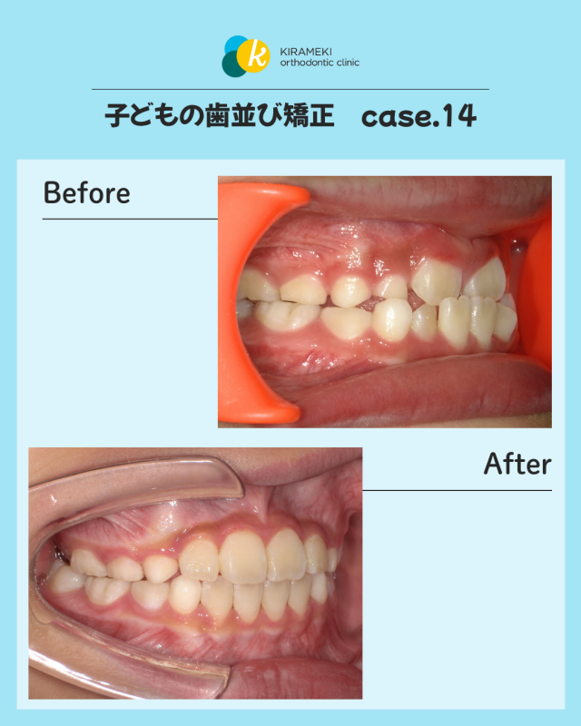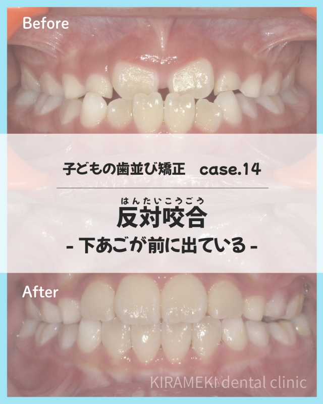 上の前歯と下の前歯のかみ合わせが反対になり下の歯が前に出てしまうかみ合わせの状態『反対咬合(はんたいこうごう)』と診断を受けたお子さまのケースです。