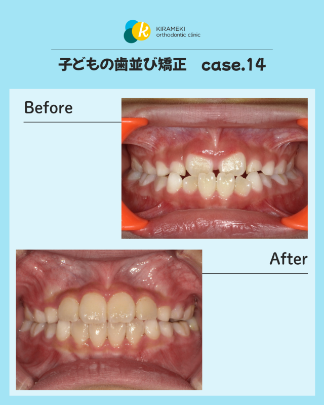 1期治療が終了し、休憩中である現在は、MFT(口腔筋機能療法)による口の周りや舌の筋肉を鍛えて正しく使えるようにするトレーニングを行いながら、この後すべての歯が永久歯に生え揃うのを待ち、最終調整の2期治療に進みます