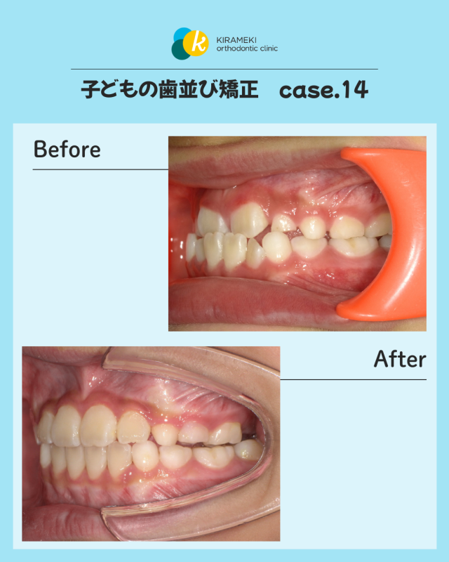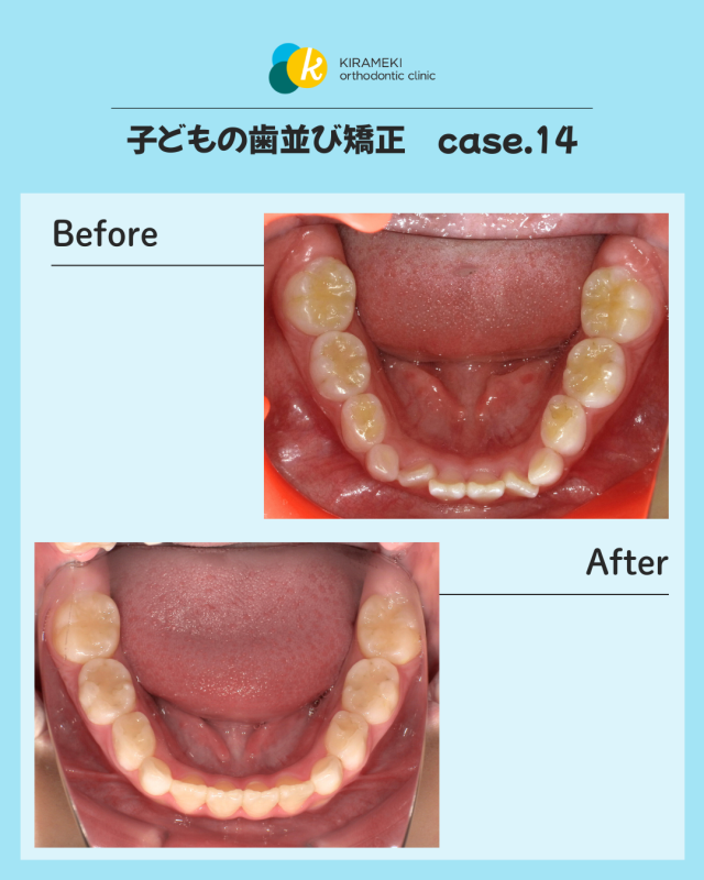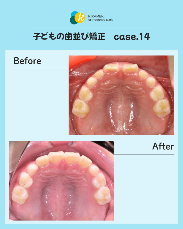 その後、あごの横幅を少しずつ広げながら歯列の拡大を行い永久歯が生えてくるスペースを確保するとともに、デコボコしていた歯をきれいに整えました。