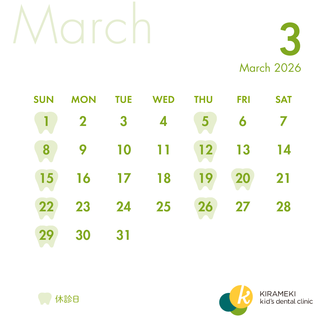 お知らせ 2026/02/24 3月の休診日について 3月の休診日について 東海市にある小児歯科、矯正歯科を専門とするきらめきデンタルクリニックです。 いつもご来院ありがとうございます。 3月の休診日は以下の通りです。 ■木曜(5日、12日、19日、26日) ■日曜(1日、8日、15日、22日、29日) ■祝日(20日) ご迷惑をおかけしますが、ご了承のほどよろしくお願いいたします。 WEBからの初診予約、予約変更はこちら